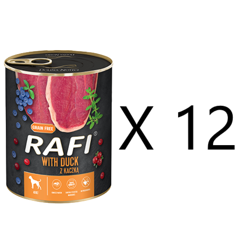 Mokra karma dla psów Rafi z kaczką, żurawiną i borówka zestaw 12 puszek każda po 400g.