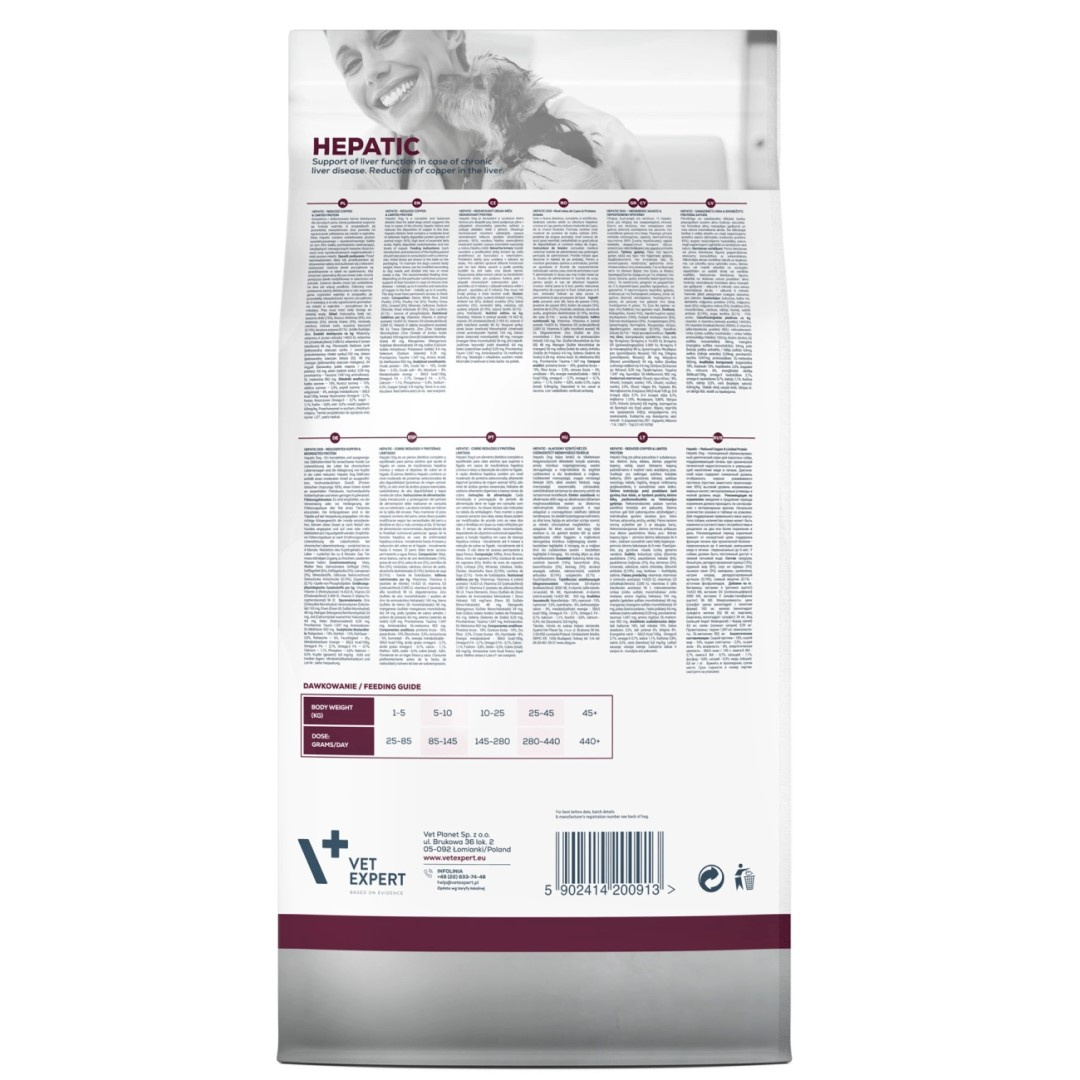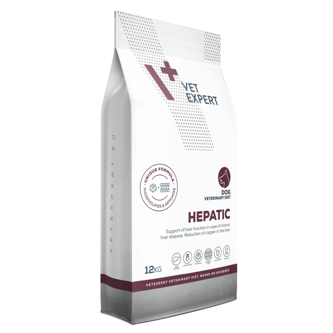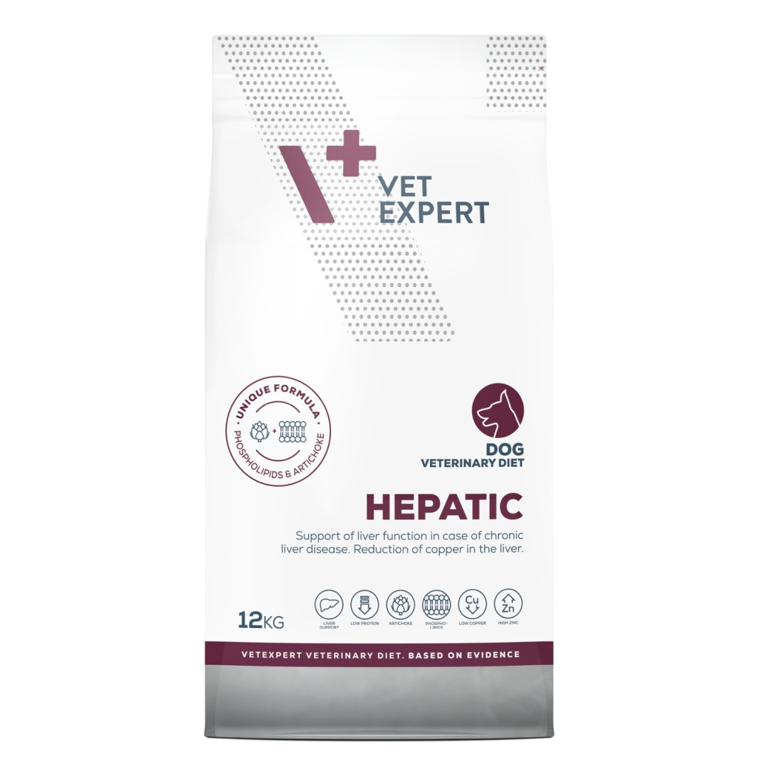 Dieta Hepatic Dog to jedyna na świecie karma z unikatowym składem, zawierająca karczocha i fosfolipidy, które posiadają udowodnione działanie wspomagające funkcje wątroby w przypadku jej niewydolności. To pełnowartościowa, pełnoporcjowa karma dietetyczna dla psów, podawanie której wspomaga czynności wątroby w przypadkach jej przewlekłej niewydolności oraz pozwala na ograniczenie odkładania się miedzi w wątrobie. Zawiera umiarkowany poziom wysokiej jakości białka (pochodzącego z drobiu, kukurydzy, ryżu), wysoki poziom niezbędnych nienasyconych kwasów tłuszczowych, wysokostrawne węglowodany oraz niski poziom miedzi.
