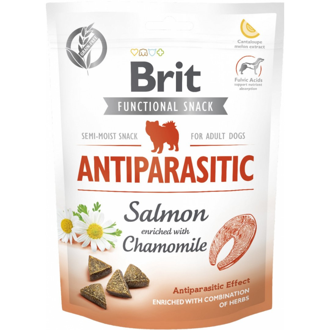 brit care dog functional snack antiparasitic uzupełniająca karma dla psów przeciwpasożytom z łososiem i rumiankiem.