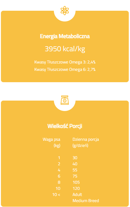 Składniki analityczne: białko surowe 32,0%, zawartość tłuszczu 18,0%, wilgotność 10,0%, popiół surowy 8,4%, włókno surowe 1,8%, wapń 1,3%, fosfor 1,0%, kwasy tłuszczowe omega-3 2,4%, kwasy tłuszczowe omega-6 2,7%.