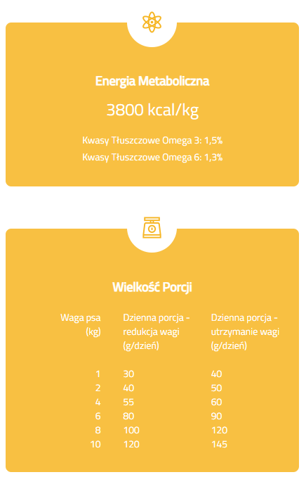 Składniki analityczne: białko surowe 26,0%, zawartość tłuszczu 12,0%, wilgotność 10,0%, popiół surowy 5,5%, włókno surowe 8,5%, wapń 1,1%, fosfor 0,9%, kwasy tłuszczowe omega-3 1,5%, kwasy tłuszczowe omega-6 1,3%.