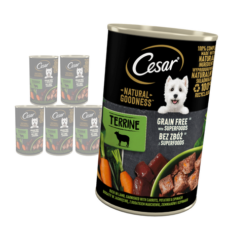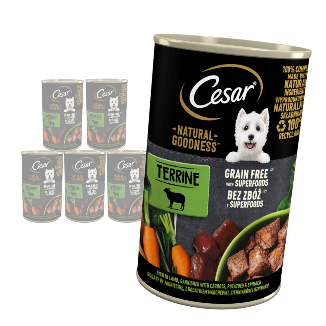 Korzyści z podawania mokrej karmy dla psa Cesar® Bogaty w Jagnięcinę:- Receptura bez zbóż z superfoods