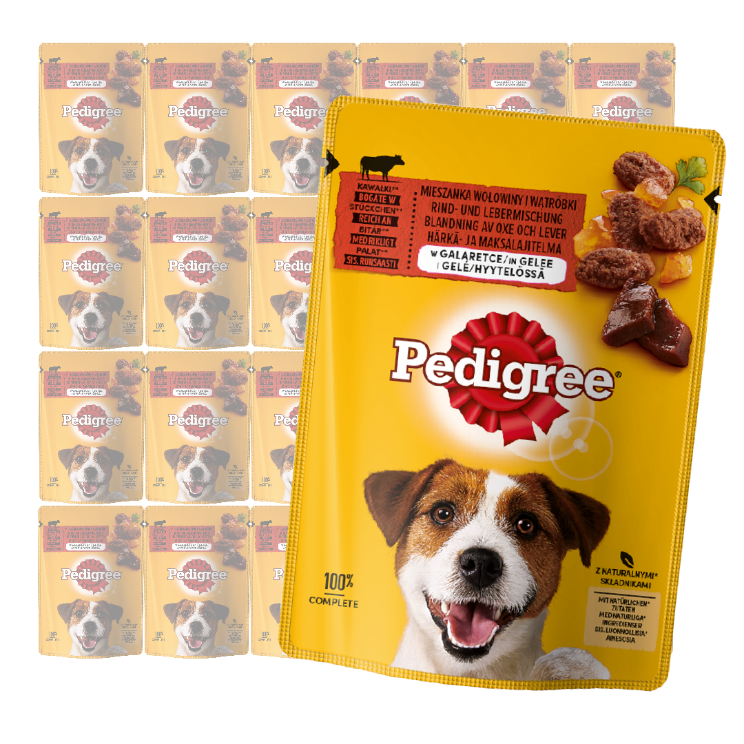 Kompletna i zbilansowana karma PEDIGREE® Adult kawałki bogate w mieszankę Wołowiny i Wątróbki w Galaretce jest pełna mięsistych kawałków zanurzonych w pysznej galaretce. Jej skład opracowany został przez lekarzy weterynarii i specjalistów ds. żywienia z Instytutu Nauki o Zwierzętach WALTHAMTM.