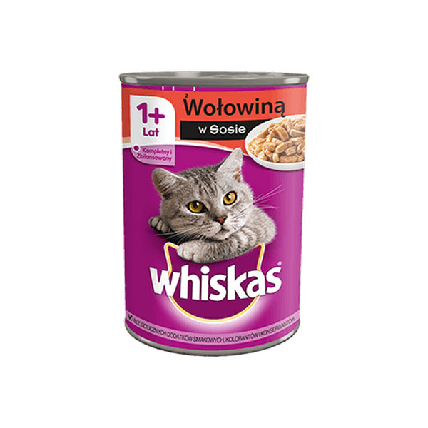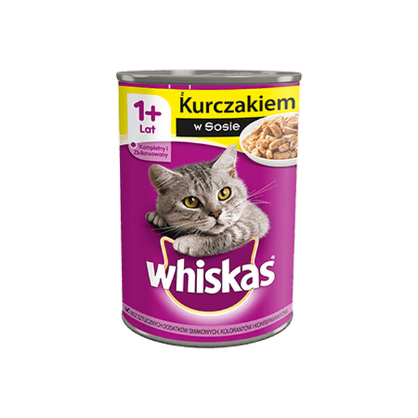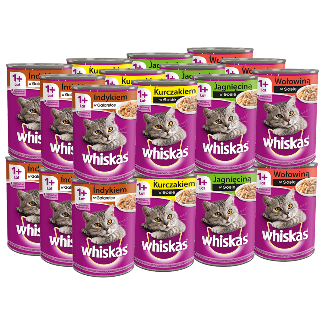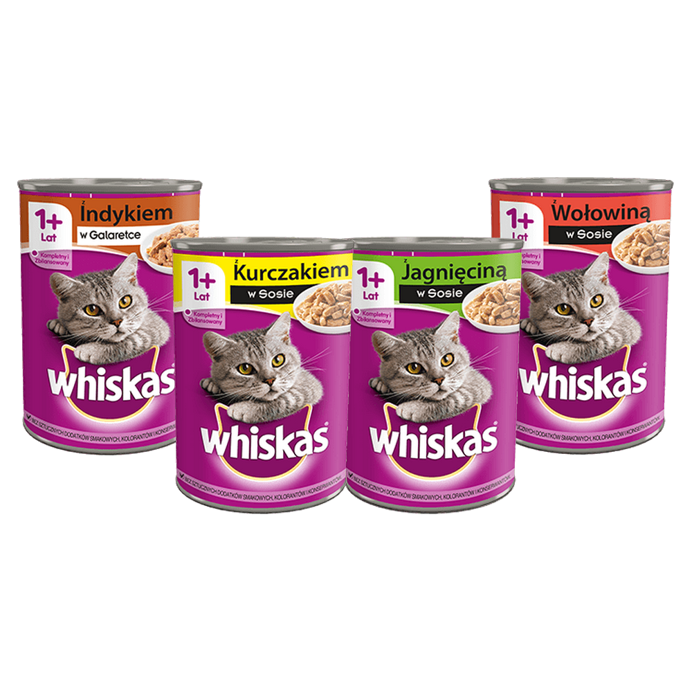 Mokra karma WHISKAS® to pełnoporcjowy posiłek w puszce dla kotów powyżej 1. roku życia. Został opracowany przez lekarzy weterynarii i specjalistów ds. dietetyki z Instytutu Nauki o Zwierzętach WALTHAM. Idealne proporcje minerałów wspierają zdrowie dróg moczowych, a cynk wzmacnia skórę i sierść.