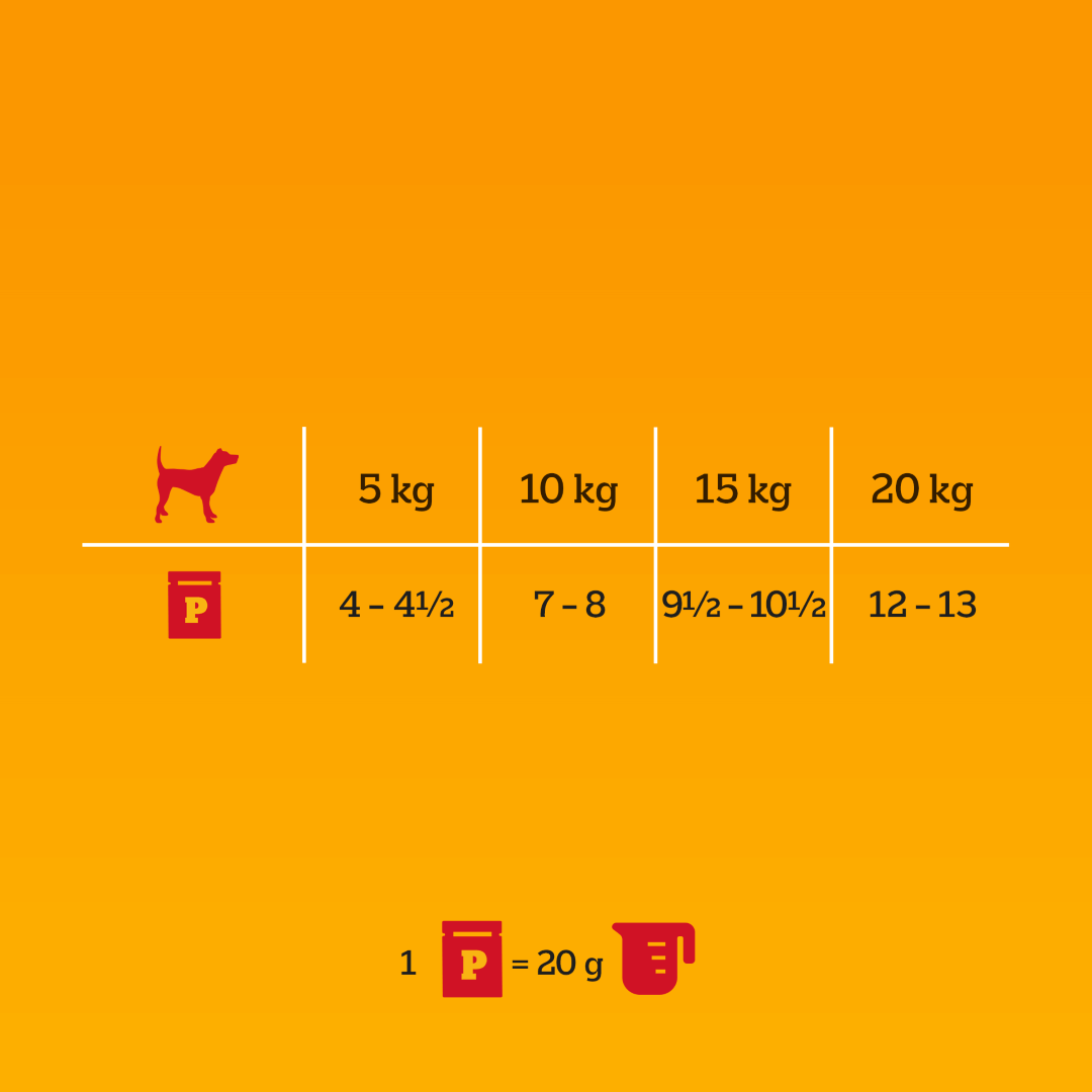 pies o masie ciała 20 kg potrzebuje 10½ - 11½ saszetki karmy mokrej lub 4 saszetek karmy mokrej i 150 g karmy suchej dziennie.