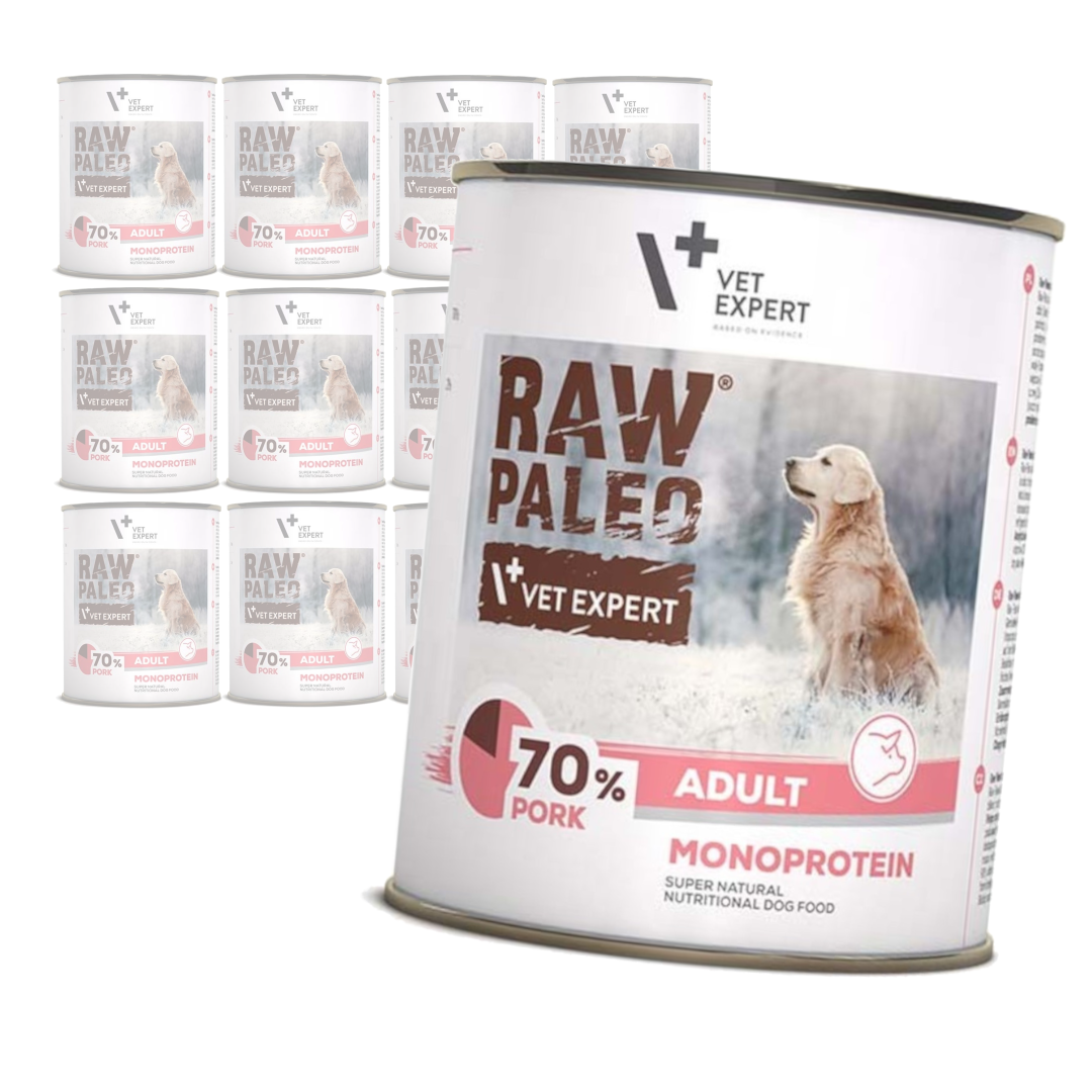 Raw Paleo Adult jest pełnoporcjową karmą bytową przeznaczoną dla psów dorosłych od ukończenia 1. roku życia. Karma nie zawiera zbóż (Grain Free) i jest jednobiałkowa, co oznacza, że wszystkie składniki pochodzenia zwierzęcego użyte do wytworzenia karmy pochodzą z wieprzowiny.