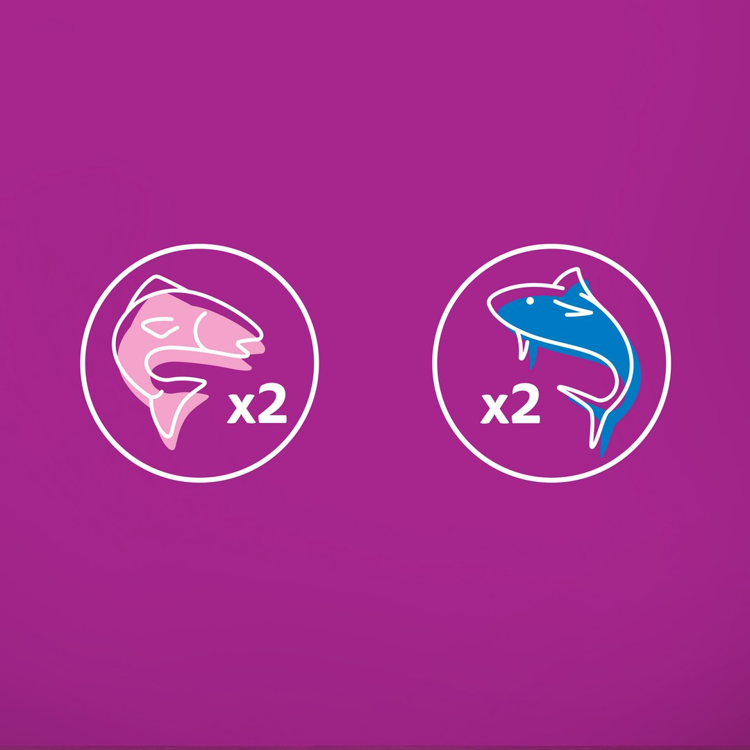 Nasze posiłki Whiskas Rybne Przysmaki w galaretce zostały specjalnie przygotowane tak, aby zachować naturalne wartości odżywcze i smak wysokiej jakości składników. Sprawią, że Twój kot przybiegnie do miski szybciej niż kiedykolwiek wcześniej! Koci przyjaciel rozsmakuje się w jednym z dwóch wariantów: kawałki z łososiem i z tuńczykiem.