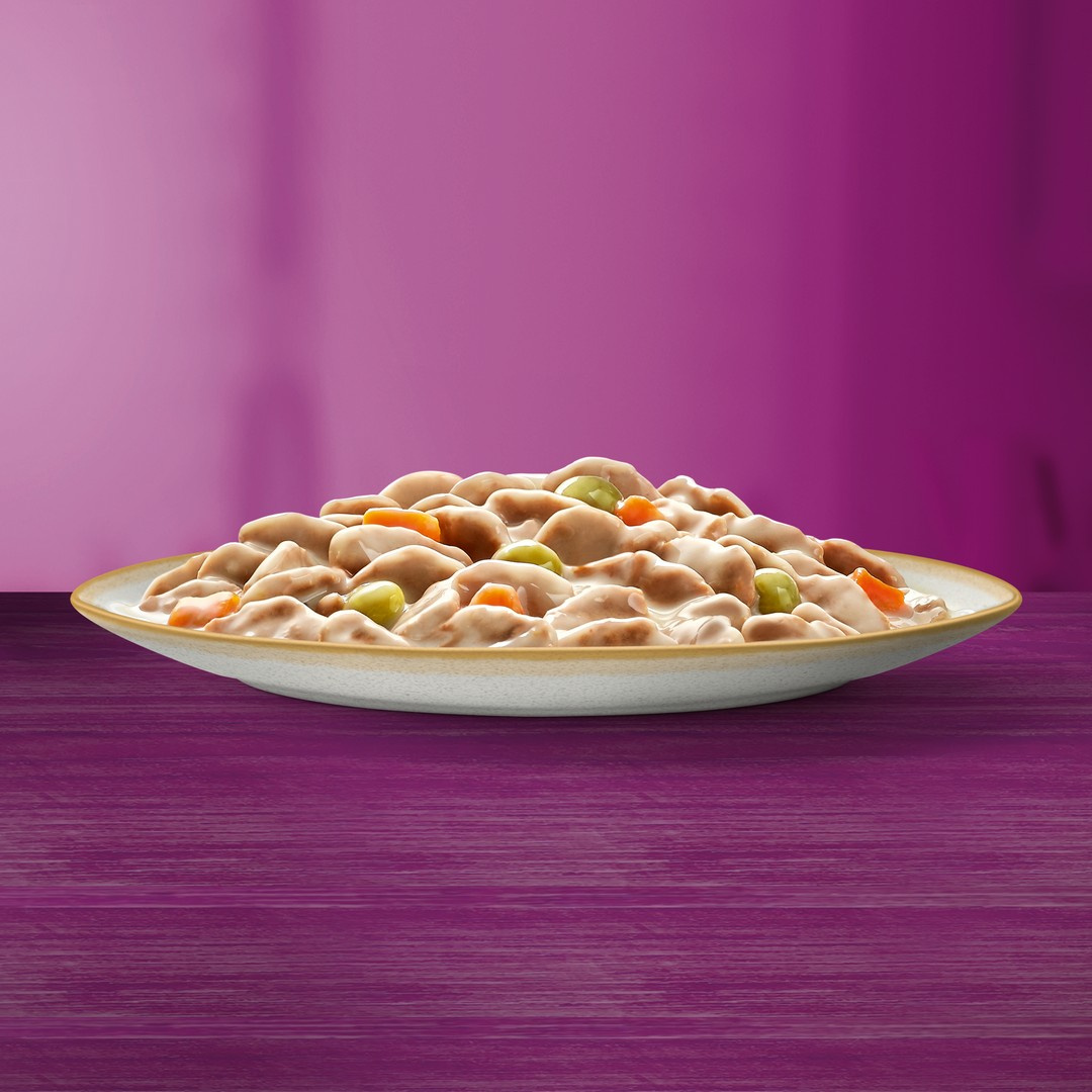 Posiłki Whiskas Kremowe Wariacje to zestaw starannie przygotowanych, kompletnych i zbilansowanych, mokrych karm dla dorosłych kotów. Koci przyjaciel rozsmakuje się w jednym z dwóch smaków: kawałki z kurczakiem i warzywami oraz z jagnięciną i indykiem.