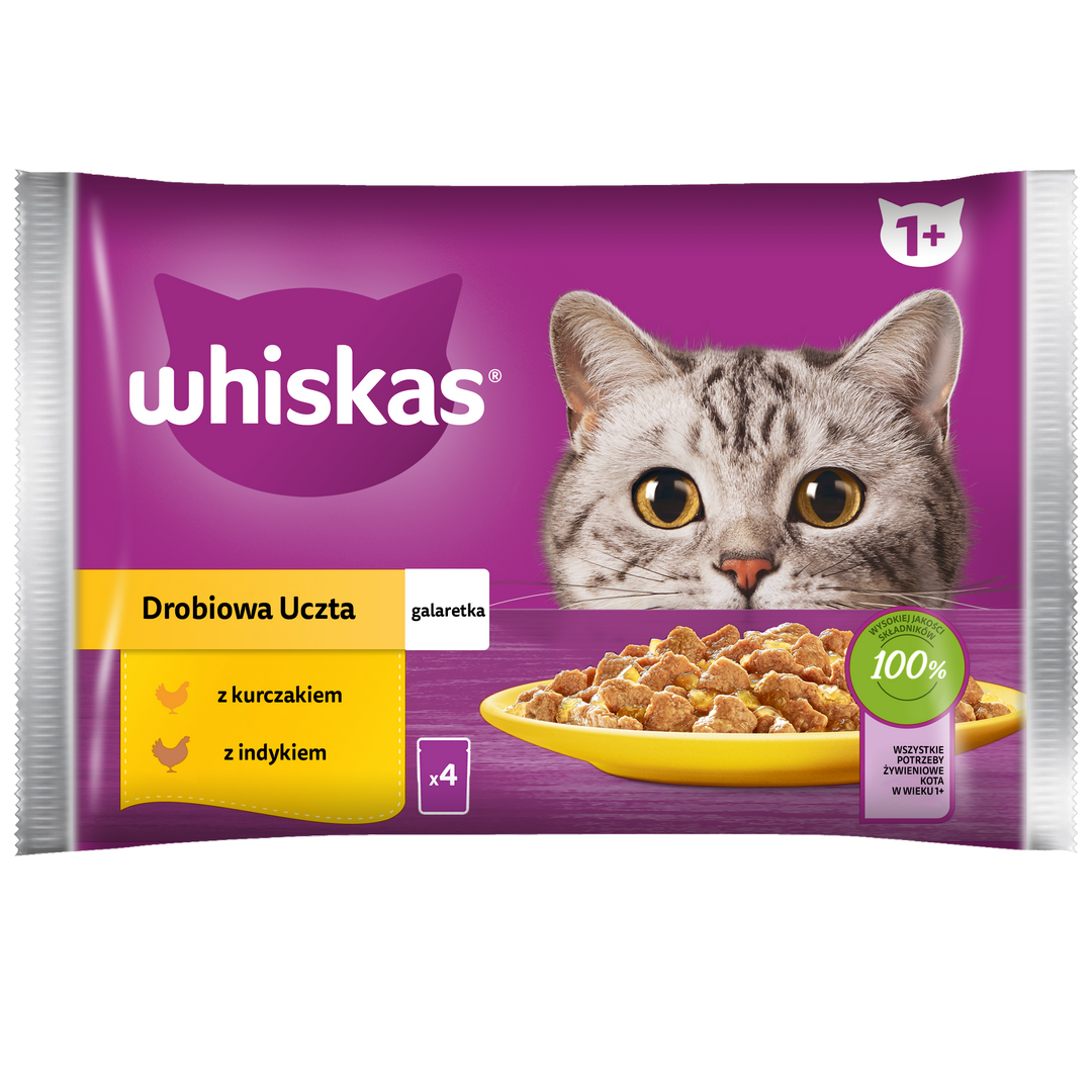 WHISKAS Adult Saszetki 4 x 85g Drobiowa Uczta Mokra Karma Dla Dorosłego Kota w Galaretce Kawałki z Kurczakiem i Indykiem