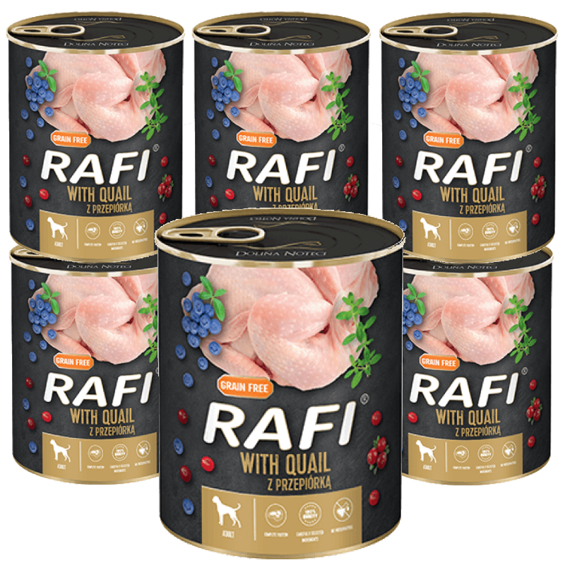 Tym, co wyróżnia mokrą karmę Rafi z przepiórką, jest wysoka zawartość białka o bogatym składzie aminokwasowym (fenyloalanina i cystyna).Mięso i surowce pochodzące z przepiórki, a szczególnie jej tłuszcz, są źródłem cennych wielonienasyconych kwasów tłuszczowych z rodziny n-6, które regulują szereg funkcji organizmu.