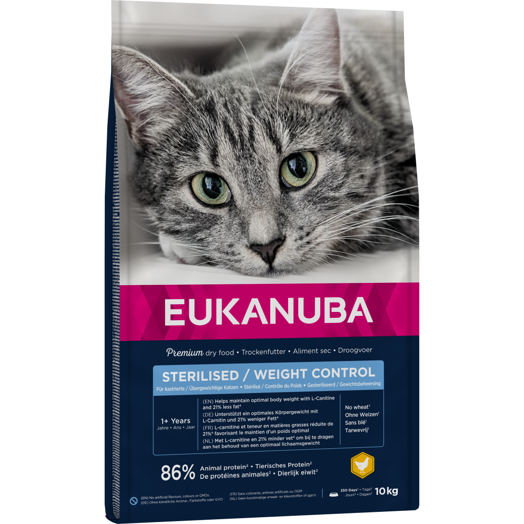 Sucha karma EUKANUBA dla dorosłych kotów sterylizowanych i z nadwagą jest smaczna i nie zawiera sztucznych aromatów, barwników ani GMO.