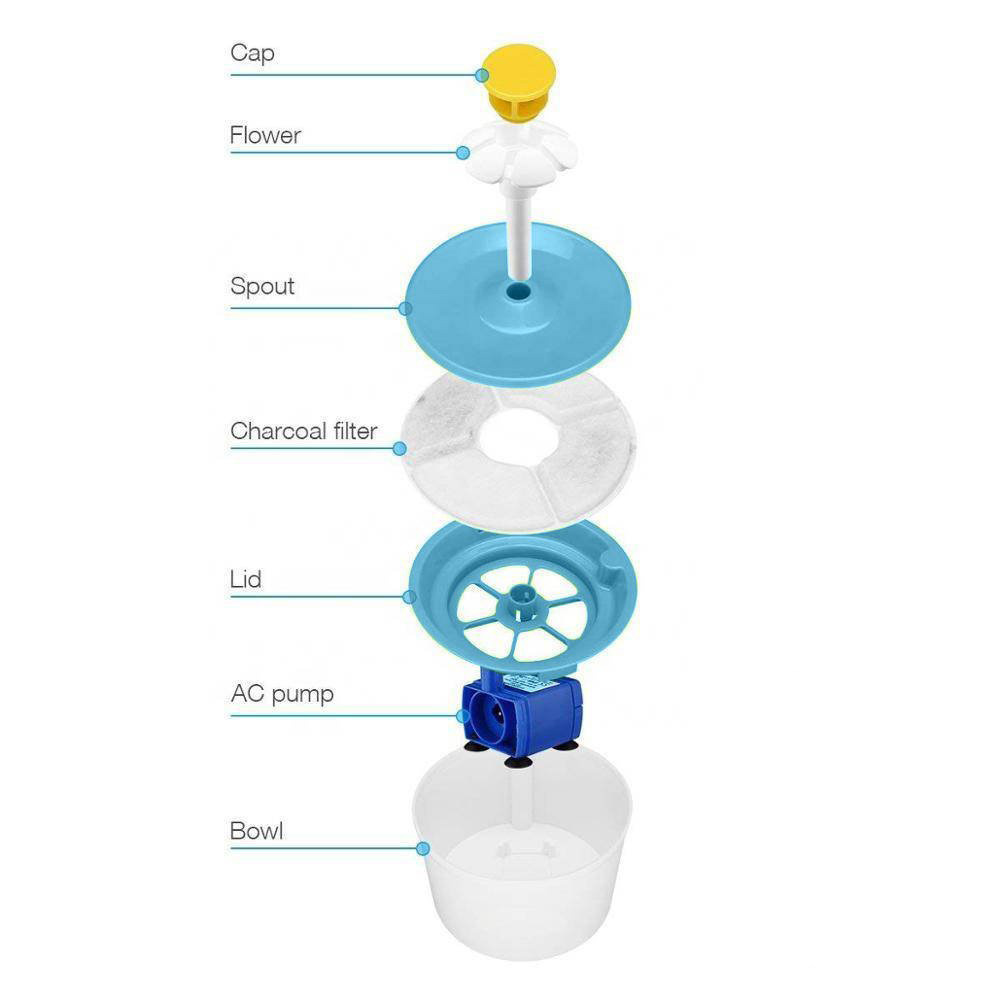 W środku konstrukcji znajduje się 3-warstwowy wymienny filtr, który doskonale oczyszcza wodę od zapachu, kurzu i innych niepożądanych sybstancji. Woda Twojego pupila będzie zawsze czysta, świeża i smaczna! Kolorowa podkładka z kwiatowym nadrukiem nie tylko sprawia funkcję dekoracyjną, zapobiega także namoknięciu podłogi wokół fontanny w razie ewentualnego dostania wody zewnątrz urządzenia. Dozownik wody jest zasilany ze pomocą kabla USB. Fontanna jest bardzo łatwa w montażu, a jej składowe elementy nadają się do mycia w zmywarce do naczyń.