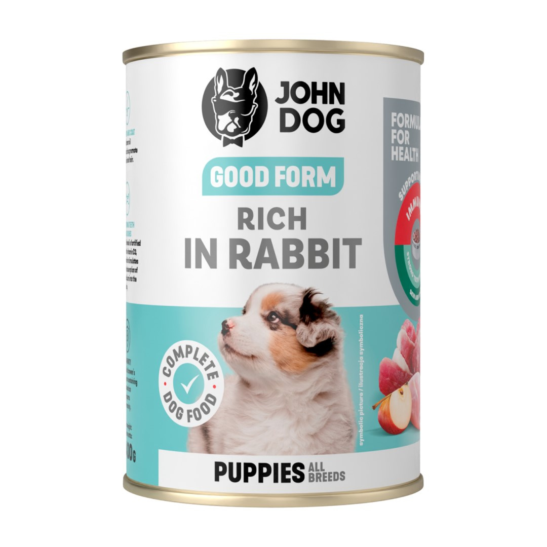 Pełnoporcjowa karma dla szczeniąt wszystkich ras, nie zawierająca glutenu. Karma mokra z linii Good Form bogata w królika / wołowinę.