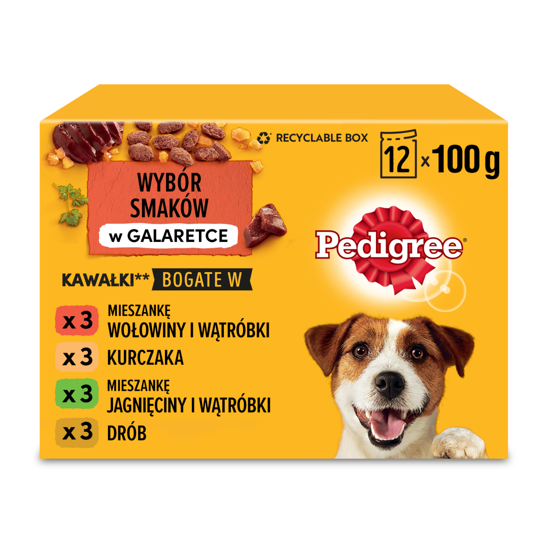 PEDIGREE® Adult Wybór Smaków w Galaretce to kompletna i zbilansowana karma pełna mięsistych kawałków zanurzonych w galaretce w czterech wersjach smakowych: kawałki bogate w mieszankę wołowiny i wątróbki, kawałki bogate w kurczaka, kawałki bogate w mieszankę jagnięciny i wątróbki oraz kawałki bogate w drób.