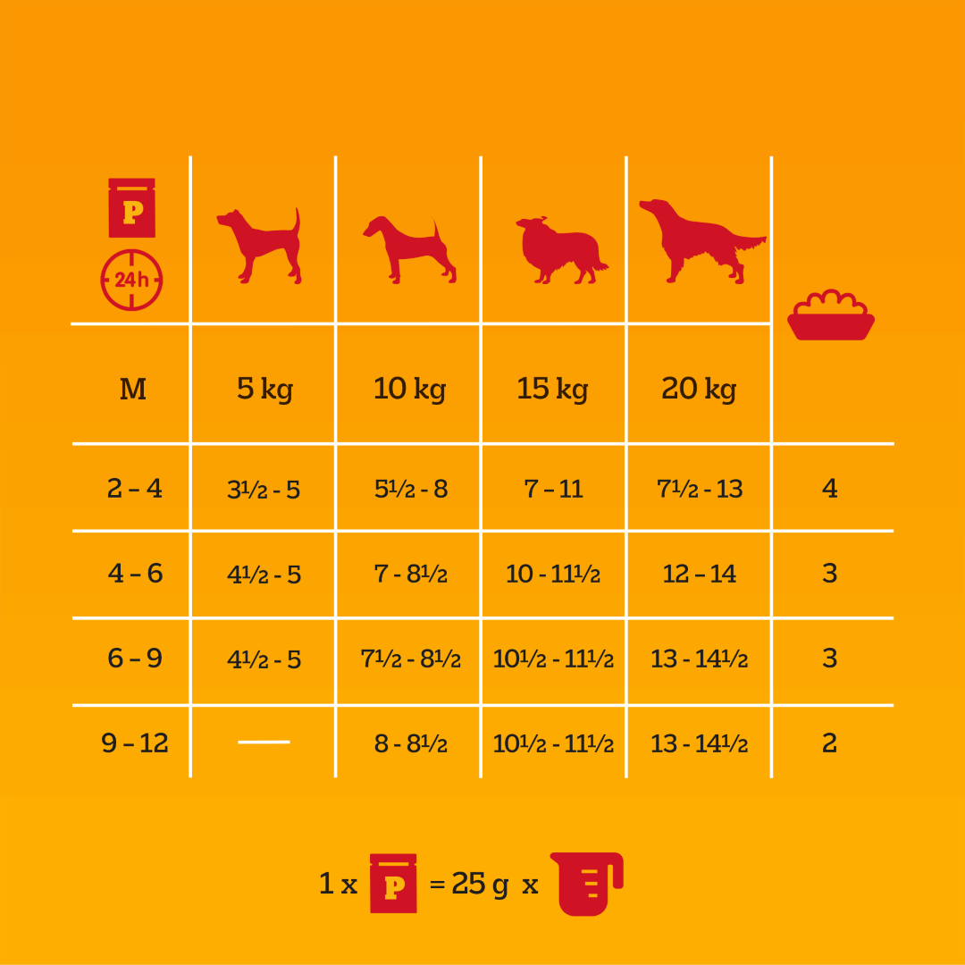 w wieku 6-12 miesięcy potrzebuje 8½ - 9½ saszetki pokarmu mokrego dziennie.