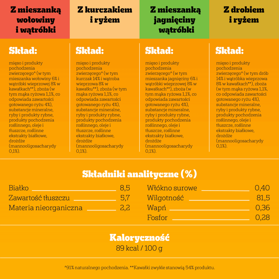 Kawałki bogate w mieszankę Wołowiny i Wątróbki: mięso i produkty pochodzenia zwierzęcego (44%, naturalnego pochodzenia^ w 95%; w tym wołowina 7% i wątróbka wieprzowa 8% w kawałkach**), substancje mineralne (1,4%), zboża (w tym mąka ryżowa 1,1%, co odpowiada zawartości gotowanego ryżu 4%), ryby i produkty rybne^, oleje i tłuszcze, produkty pochodzenia roślinnego^, roślinne ekstrakty białkowe. ^Składniki naturalnego pochodzenia. **kawałki zwykle stanowią 54% produktu.