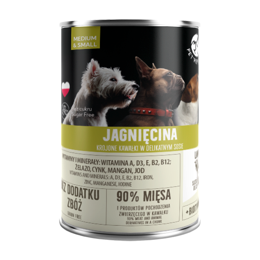 (2x400g) Z Jagnięciną Skład: mięso i produkty pochodzenia zwierzęcego (90% mięsa i produktów pochodzenia zwierzęcego w kawałku, 4% jagnięcina), produkty pochodzenia roślinnego, minerały.