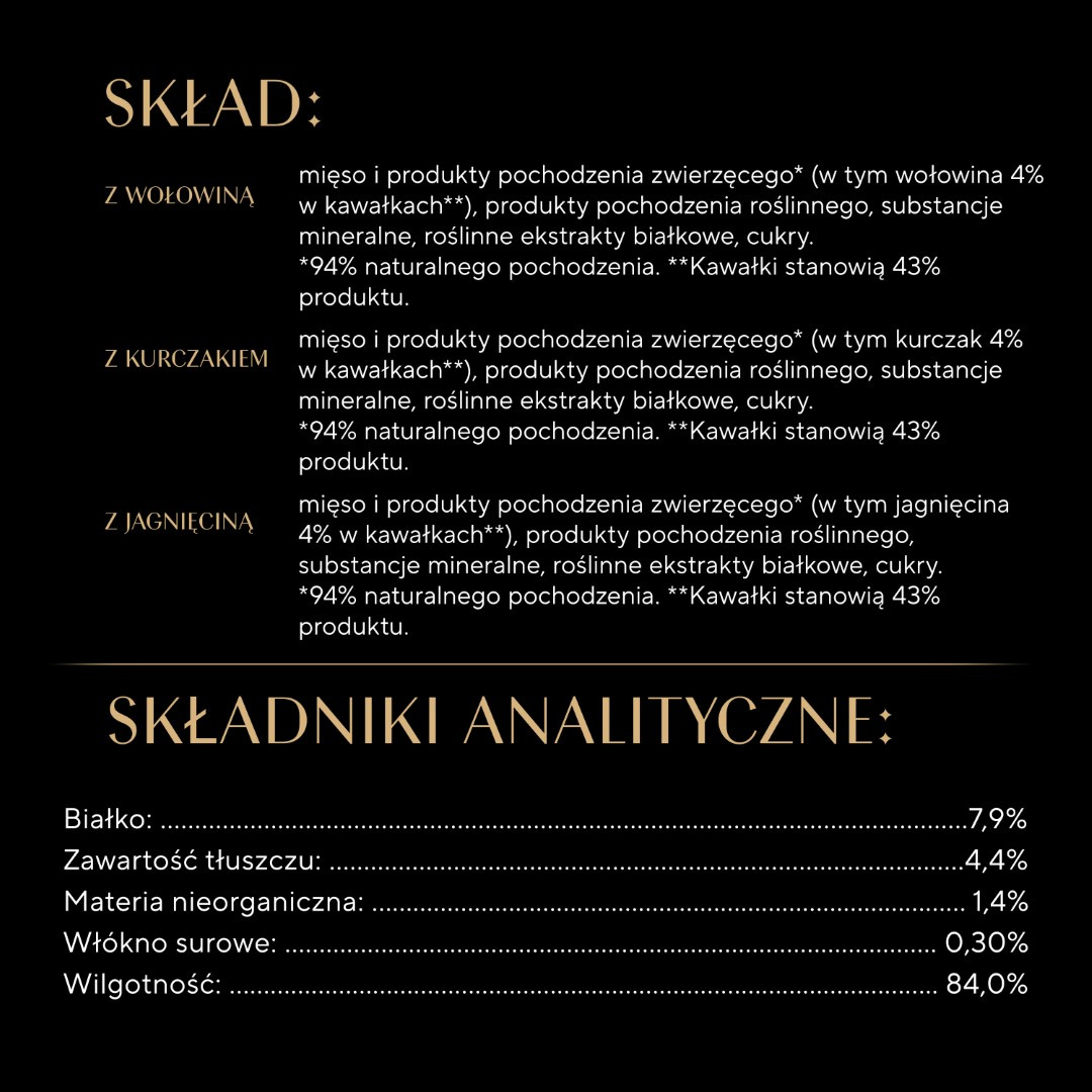 Z jagnięciną. Skład: mięso i produkty pochodzenia zwierzęcego* (w tym jagnięcina 4% w kawałkach**), produkty pochodzenia roślinnego, substancje mineralne, roślinne ekstrakty białkowe, cukry. *94% naturalnego pochodzenia. **Kawałki stanowią 43% produktu.