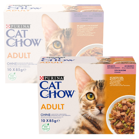Podaruj swojemu kotu smakowite doświadczenie z Purina® Cat Chow® Adult z łososiem / jagnięciną i zieloną fasolką w galaretce, idealnej karmie dla dorosłych kotów.
