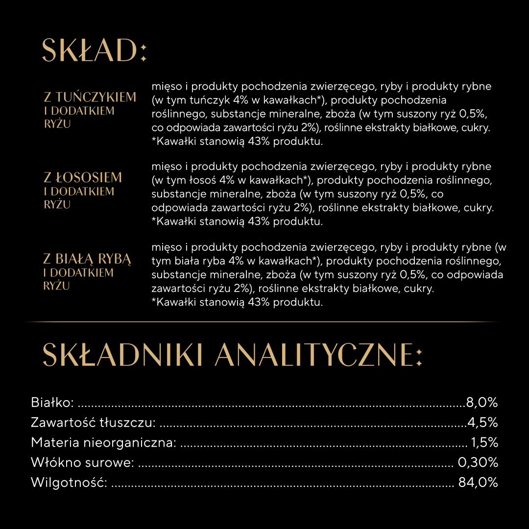 Z białą rybą: mięso i produkty pochodzenia zwierzęcego, ryby i produkty rybne (w tym biała ryba 4% w kawałkach*), produkty pochodzenia roślinnego, substancje mineralne, zboża (w tym suszony ryż 0,5%, co odpowiada zawartości ryżu 2%), roślinne ekstrakty białkowe, cukry.