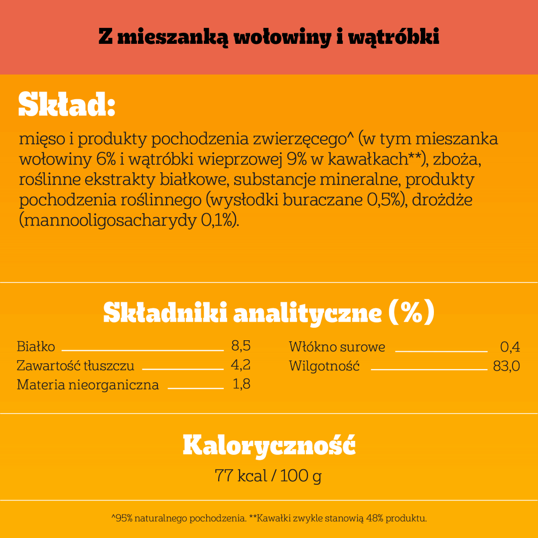 Skład: mięso i produkty pochodzenia zwierzęcego (40%, naturalne* w 93%; w tym mieszanka wołowiny 6% i wątróbki wieprzowej 9% w kawałkach**), roślinne ekstrakty białkowe, zboża, oleje i tłuszcze, substancje mineralne (0,6%), produkty pochodzenia roślinnego* (w tym wysłodki buraczane suszone 0,5%). *składniki naturalnego pochodzenia. **kawałki zwykle stanowią 48% produktu.