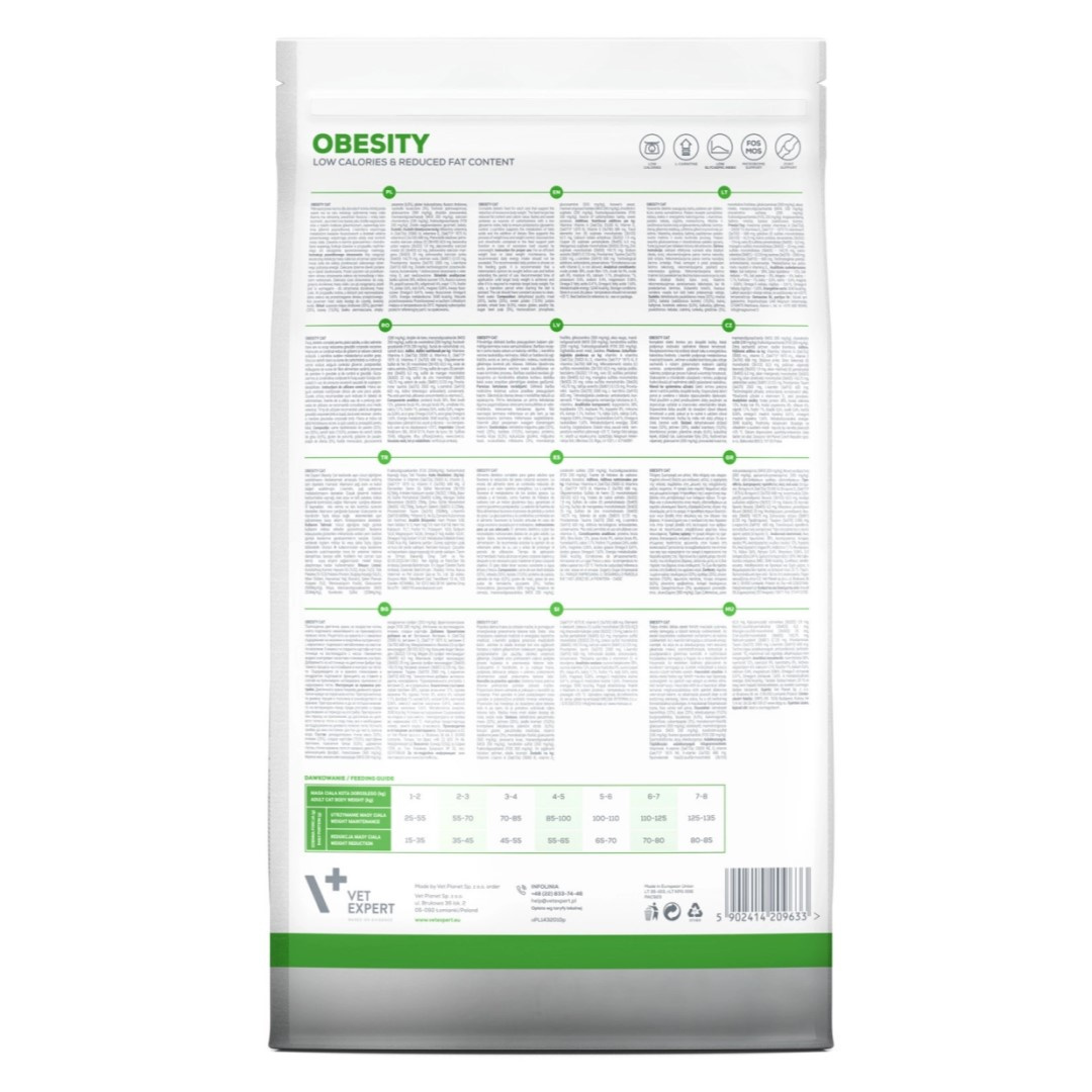 OBESITY CAT to pełnoporcjowa karma dla dorosłych kotów, której podawanie ma na celu redukcję nadmiernej masy ciała. Karma ma obniżoną zawartość tłuszczu i niską kaloryczność. L-karnityna wspomaga metabolizm kwasów tłuszczowych. Dodatek źródeł włókna pokarmowego wspomaga proces utraty oraz kontroli masy ciała. Zawarta w karmie glukozamina i chondroityna wspierają funkcje stawów w przypadku ich nadmiernego obciążenia spowodowanego nadwagą.