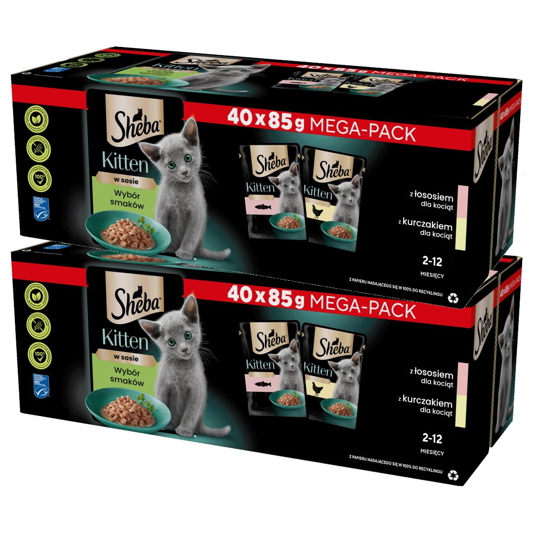 Sheba® Kitten Wybór Smaków to mieszanka starannie wyselekcjonowanych, delikatnych kawałków w przepysznym sosie. Proste receptury wspierają zdrowy wzrost Twojego dorastającego przyjaciela. To propozycja posiłków w postaci mięciutkich kawałeczków, z łososiem i z kurczakiem, idealna dla mlecznych zębów i dopasowana perfekcyjnie do małych pyszczków.
