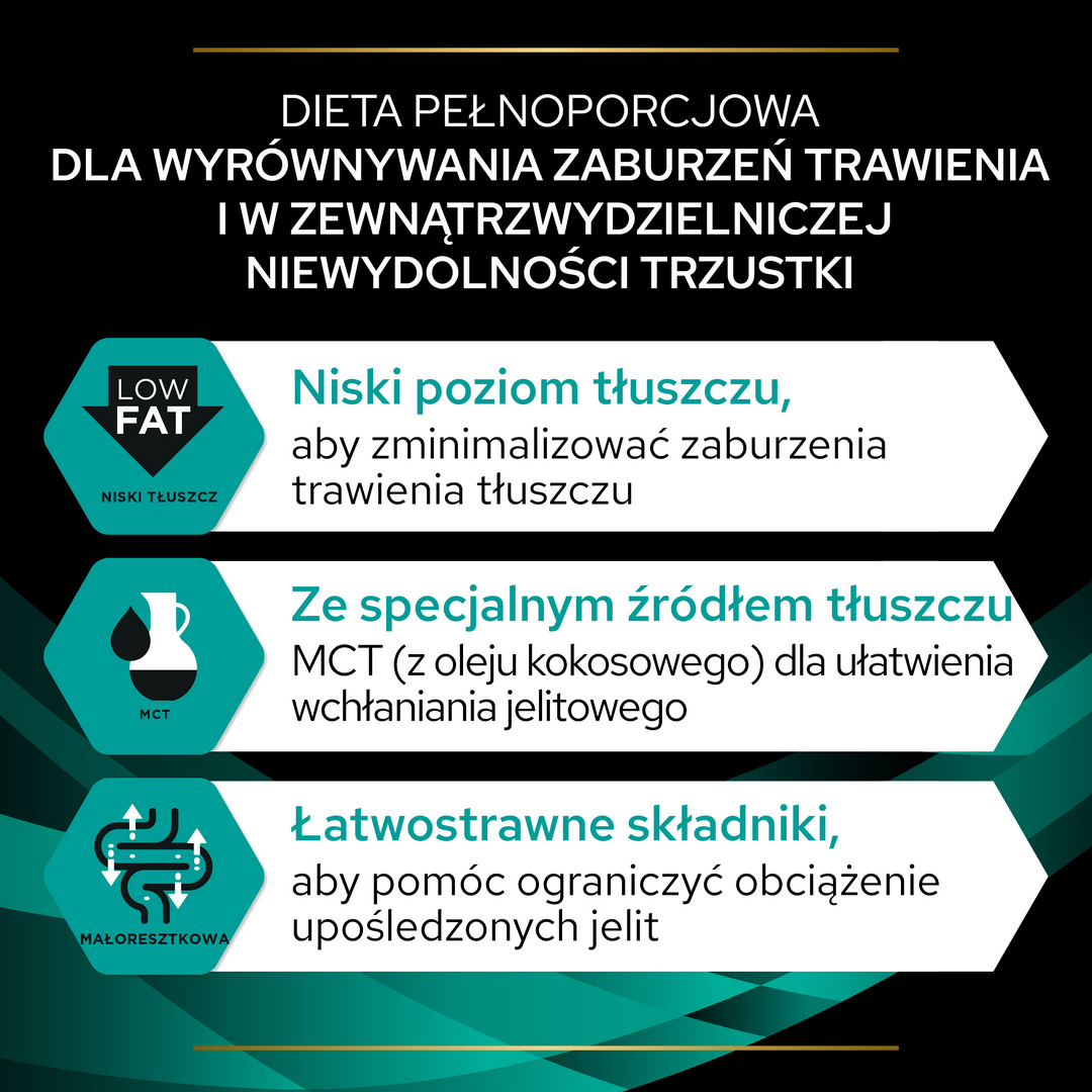 Pełnoporcjowa karma dietetyczna dla dorosłych psów, wysokostrawna, o niskiej zawartości włókna, zalecana do wyrównywania zaburzeń trawienia i zewnątrzwydzielniczej niewydolności trzustki.