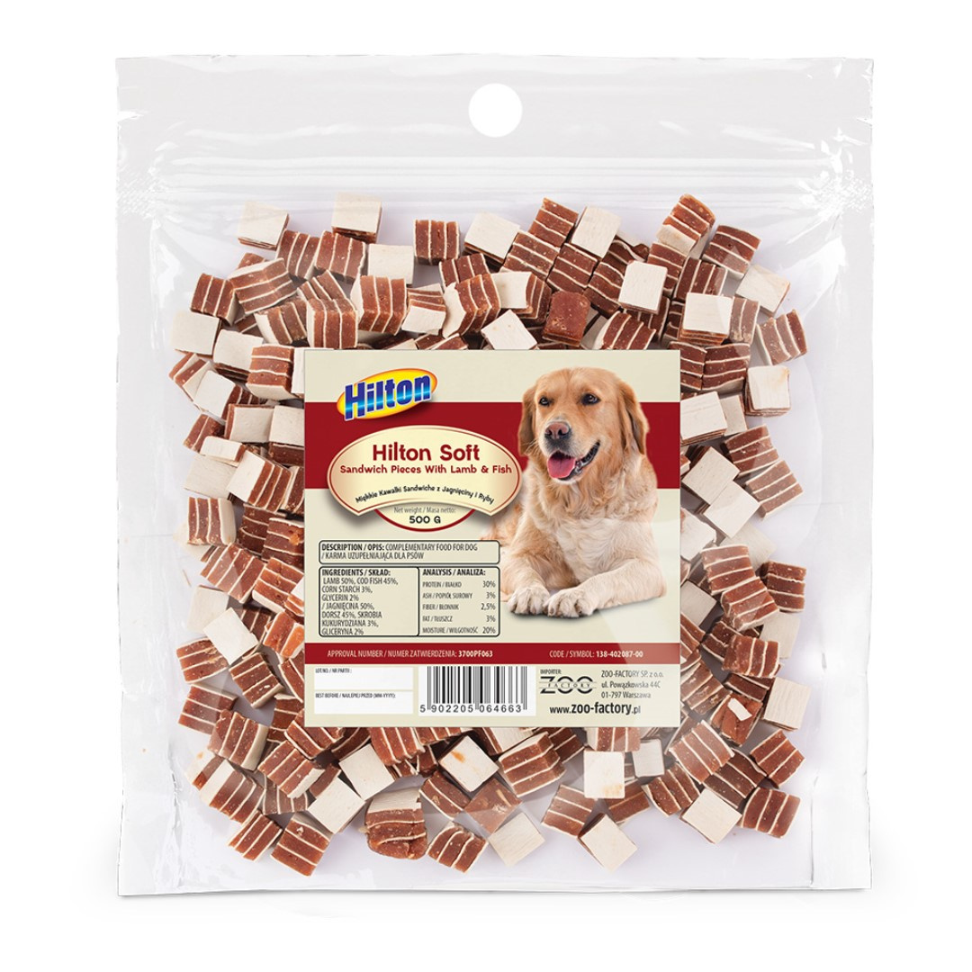 Miękkie kawałki sandwiche z jagnięciny i ryby to idealna przekąska dla Twojego psa. Niskotłuszczowe i lekkostrawne przysmaki, są doskonałym uzupełnienie karmy podstawowej dla psów.