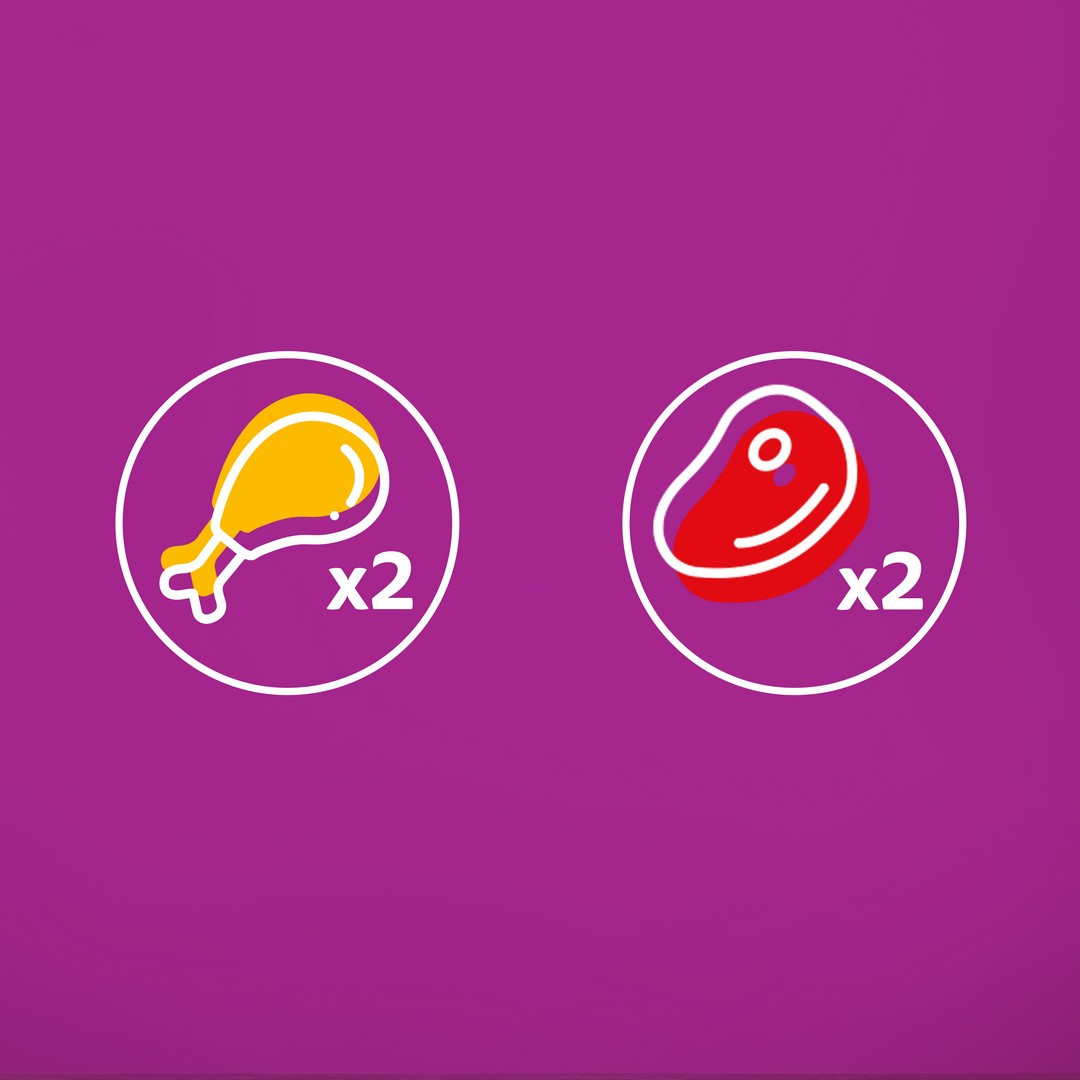 Kawałki z kurczakiem - skład: mięso i produkty pochodzenia zwierzęcego (21%, 100% naturalne*; w tym kurczak 4% w kawałkach**), roślinne ekstrakty białkowe, substancje mineralne (0,7%), cukry, produkty pochodzenia roślinnego. *Składniki naturalnego pochodzenia. **Kawałki zwykle stanowią 33% produktu.