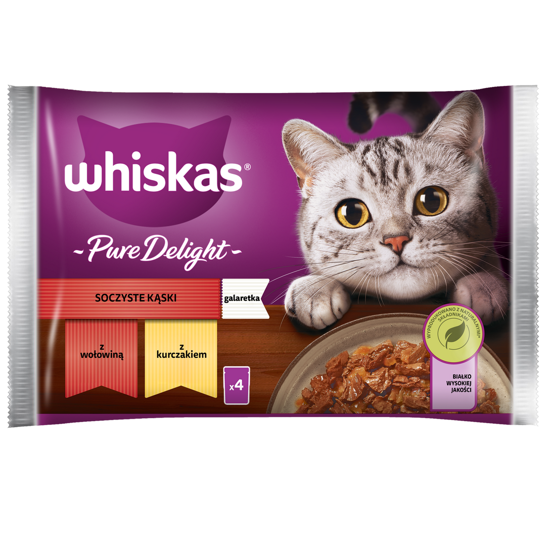 Karma Whiskas jest przygotowana z naturalnymi składnikami i wysokiej jakości białkiem, bez użycia sztucznych barwników i konserwantów dla wyjątkowej przyjemności jedzenia. Łatwe do zjedzenia pyszne, delikatne kąski zawierają cynk, który wspiera zdrowie skóry i sierści, a odpowiedni bilans minerałów pomaga zadbać o kondycję dróg moczowych Twojego pupila.