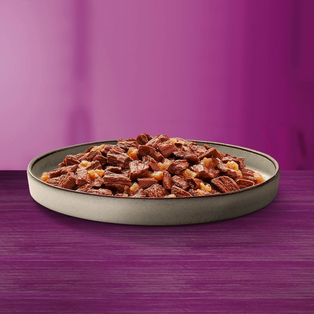 Kawałki z wołowiną - skład: mięso i produkty pochodzenia zwierzęcego (20%, 97% naturalnego pochodzenia*; w tym wołowina 4% w kawałkach**), roślinne ekstrakty białkowe, substancje