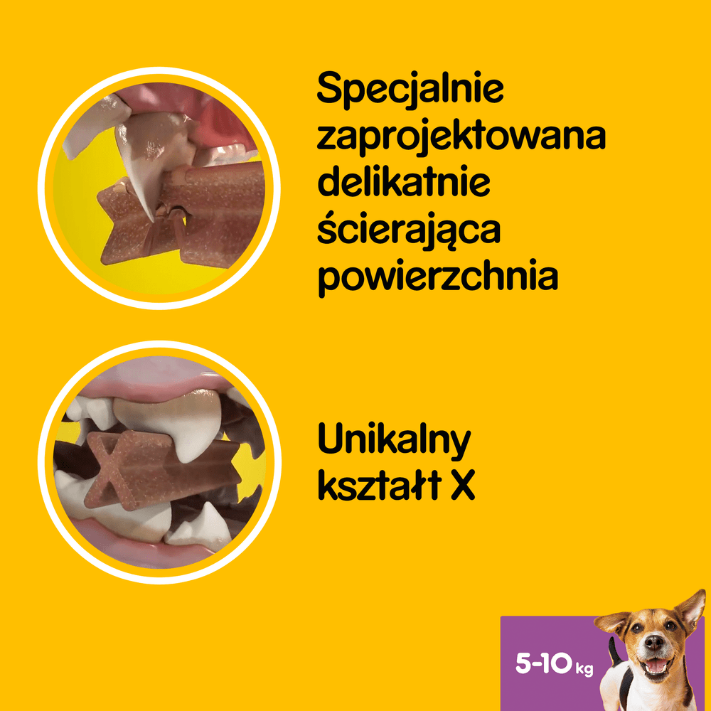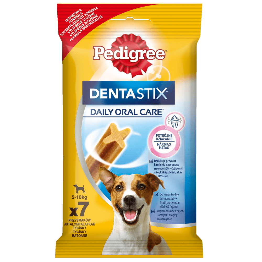 Pedigree DentaStix to smaczny przysmak dentystyczny o unikalnym kształcie X i specjalnej powierzchni ściernej dla psów małych ras. Podawany codziennie ogranicza powstawanie kamienia nazębnego nawet do 80%, co zostało udowodnione badaniami naukowymi. Przysmaki Pedigree DentaStix posiadają strukturę o delikatnych właściwościach ścierających i aktywne składniki, które pomagają ograniczać gromadzenie się osadu i kamienia nazębnego. Dodatkowo, DentaStix zostały opracowane tak, aby Twój pupil długo je żuł, co zwiększa ich skuteczność. Przysmak Pedigree DentaStix ma niską zawartość tłuszczu, nie zawiera sztucznych barwników, aromatów ani dodatku cukru.