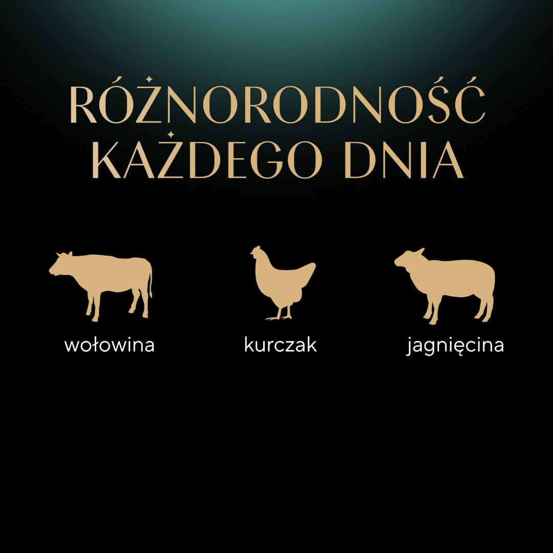Z wołowiną. Skład: mięso i produkty pochodzenia zwierzęcego* (w tym wołowina 4% w kawałkach**), produkty pochodzenia roślinnego, substancje mineralne, roślinne ekstrakty białkowe, cukry. *94% naturalnego pochodzenia. **Kawałki stanowią 43% produktu.