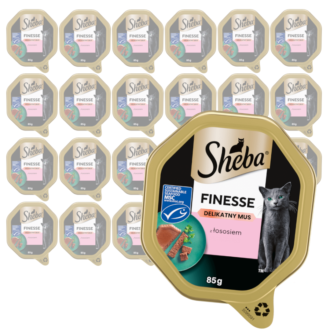 Pełnoporcjowa karma Sheba® Finesse to prawdziwa rozkosz w formie delikatnego musu dla Twojego kociego przyjaciela. Propozycja posiłku z łososiem zachwyci podniebienia nawet najbardziej wymagających kotów.