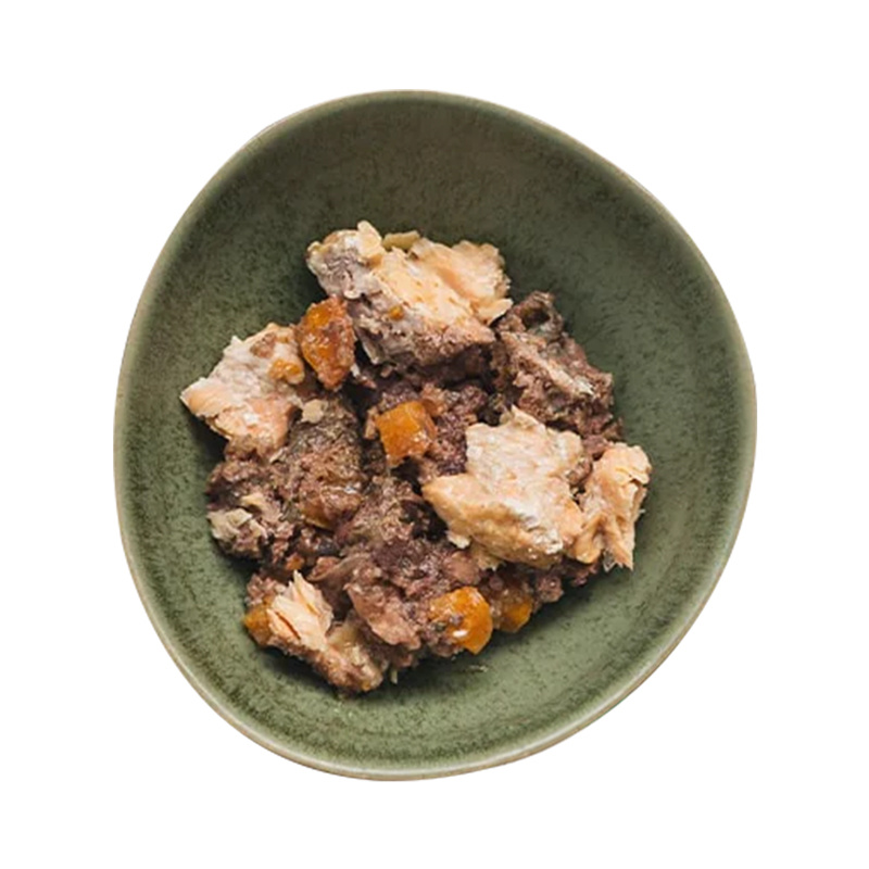 60 % wołowina (30 % mielone mięso, 10 % kość szpikowa, 10 % serce, 5 % wątroba, 5 % nerka), 30 % łosoś, 7 % marchew, 3 % szpinak.