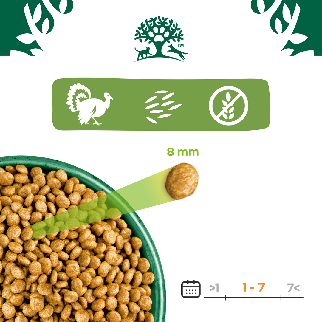 Skład: suszone białko z indyka* (30%), skrobia grochowa, tłuszcz drobiowy*, białko grochu, suszone ziemniaki*, białko ziemniaczane, sos z indyka, miazga pomidorowa* (3,5%), całe siemię lniane* (1,5%), suszony wywar bezmięsny, substancje mineralne, olej z ryb, ekstrakt z cykorii* (0,25%), suszona marchewka* (0,1%), ekstrakt z żurawiny* (0,05%), ekstrakt z jukki* (0,02%). *Składnik naturalnego pochodzenia. Wyprodukowano w zakładzie przetwarzającym zboża i inne źródła białka.