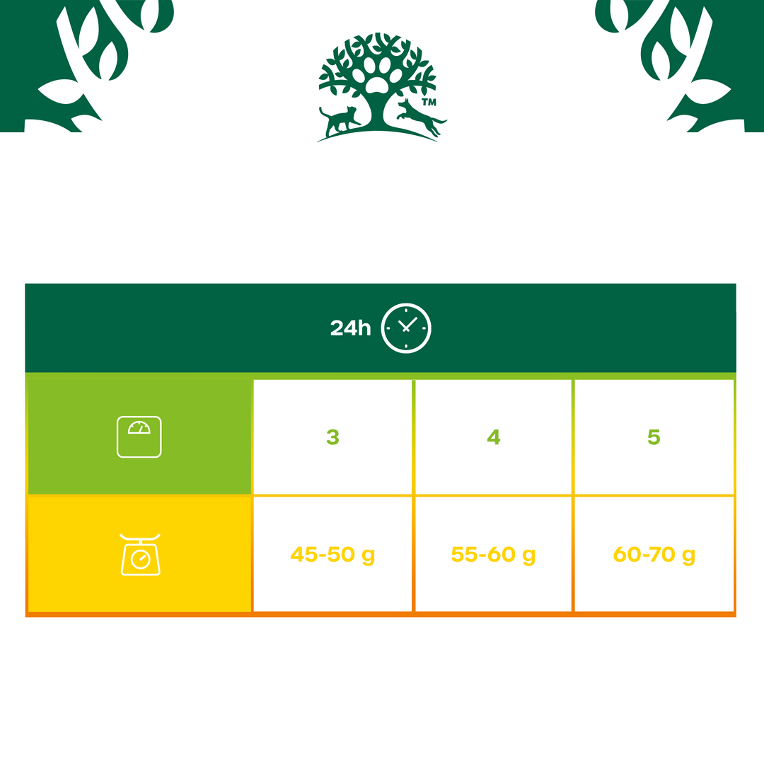 W przypadku mieszania karmy suchej i mokrej James Wellbeloved™ należy zmniejszyć zalecaną ilość karmy suchej o 20 g na każde 100 g karmy mokrej. Przy zmianie diety należy wprowadzać karmę stopniowo. Należy uwzględnić kalorie pochodzące z przysmaków. Ilości karmy są podane wyłącznie jako wskazówki. Należy dostosować ilość karmy do wieku, rozmiaru i poziomu aktywności kota. Podzielić na porcje do podania w ciągu dnia. Zapewnij świeżą wodę do picia. Przechowywać w chłodnym i suchym miejscu.