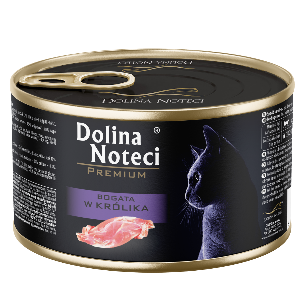 Karma Dolina Noteci Premium bogata w królika jest produktem niskotłuszczowym, ale o wysokiej zawartości naturalnie występującego w mięsie i podrobach z królika kwasu arachidonowego – niezbędnego do prawidłowego funkcjonowania organizmu kota.