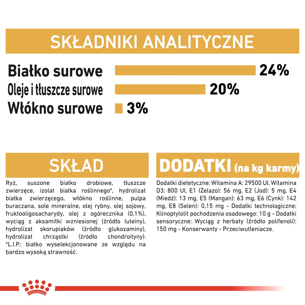 Skład: ryż, suszone białko drobiowe, tłuszcze zwierzęce, izolat białka roślinnego*, hydrolizat białka zwierzęcego, włókno roślinne, pulpa buraczana, sole mineralne, olej rybny, olej sojowy, fruktooligosacharydy, olej z ogórecznika (0,1%), wyciąg z aksamitki wzniesionej (źródło luteiny), hydrolizat skorupiaków (źródło glukozaminy), hydrolizat chrząstki (źródło chondroityny).
