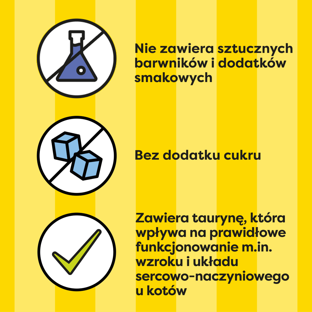 ✓ Zawiera taurynę, która wpływa na prawidłowe funkcjonowanie m.in. wzroku i układu sercowo-naczyniowego u kotów.