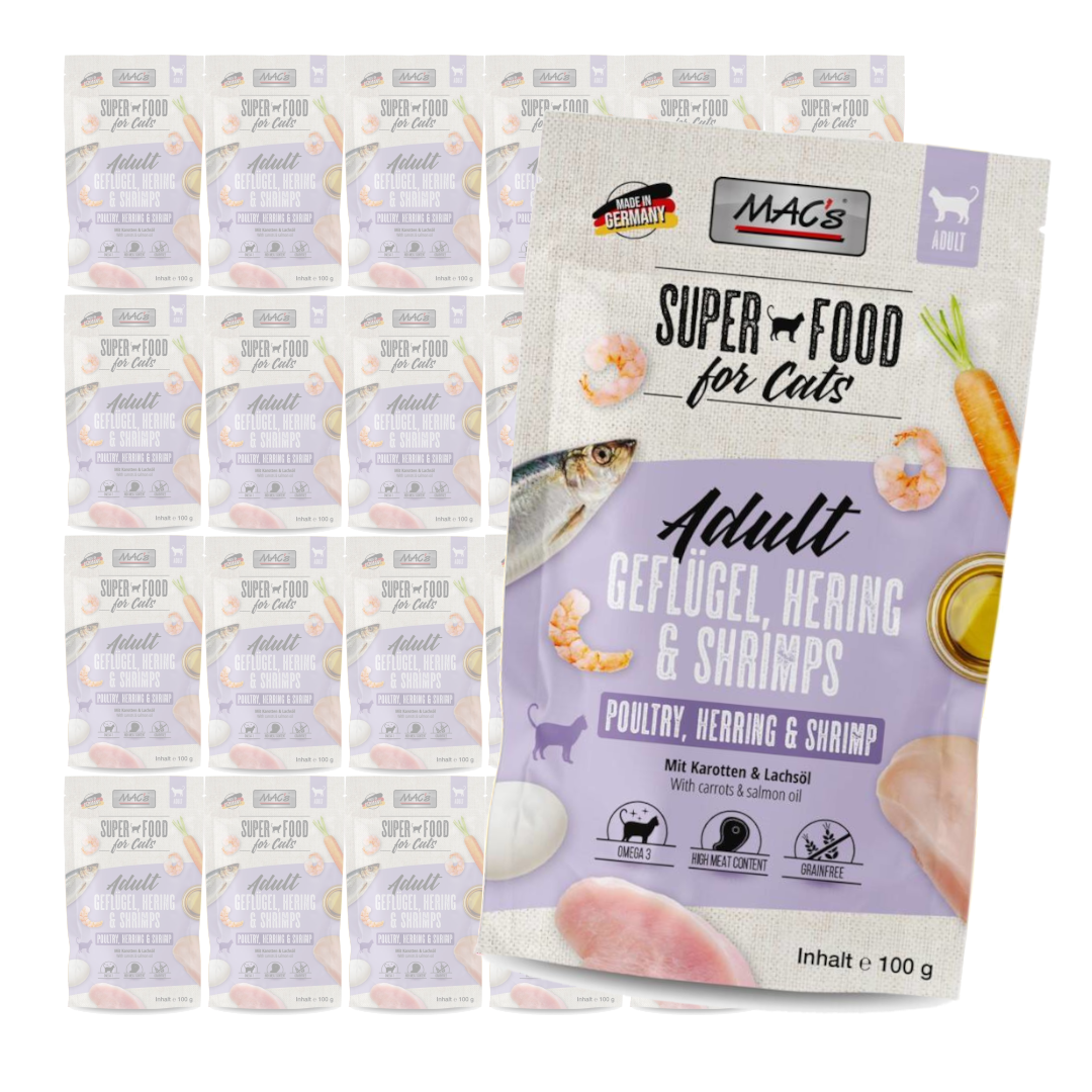 Poultry, Herring & Shrimp firmy MAC to karma nr 1 dla każdego kota domowego, który uwielbia ryby i owoce morza. Ta specjalna receptura została wzbogacona olejem z łososia, który jest bogaty w nienasycone kwasy tłuszczowe omega i zapewnia błyszczącą sierść i zdrową skórę.