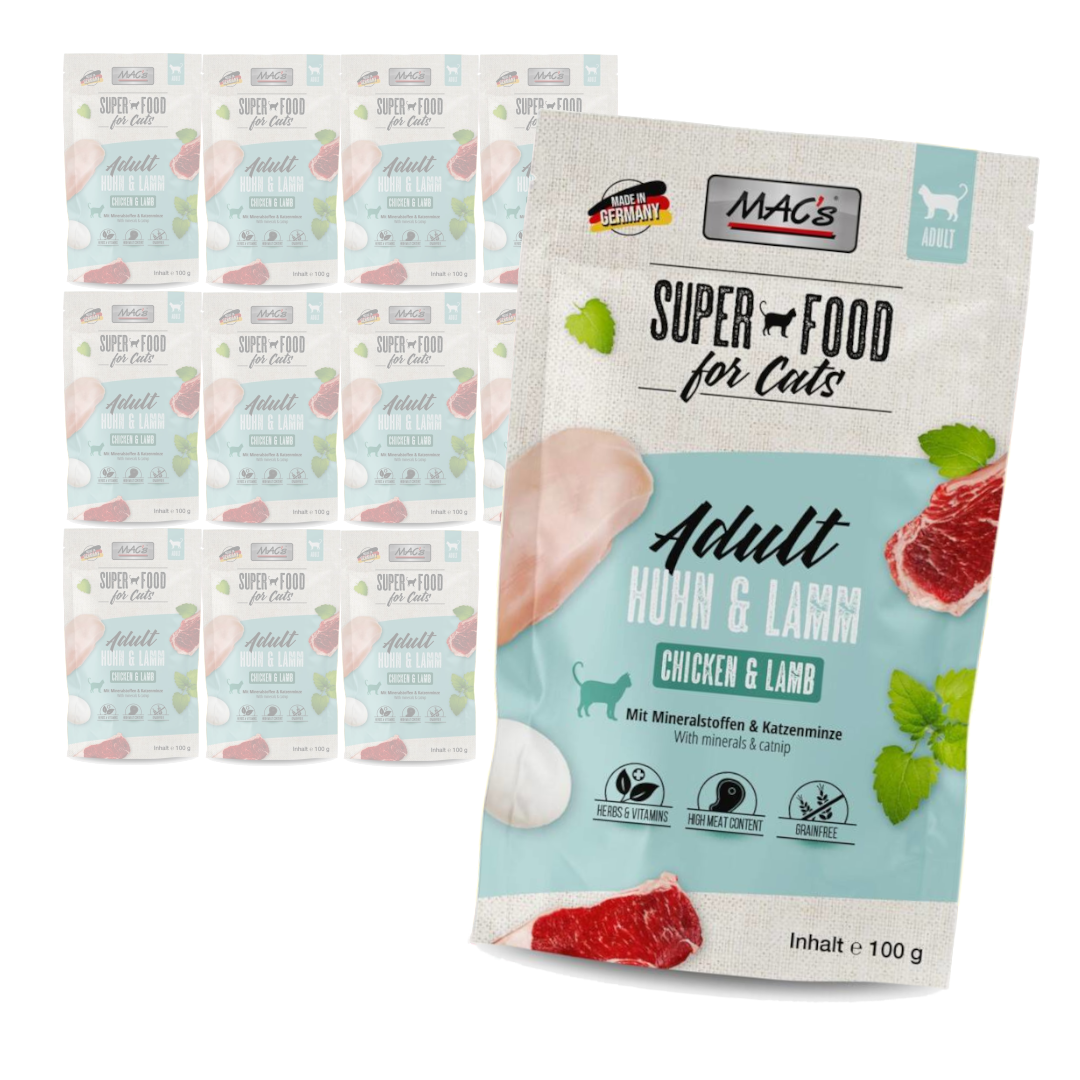 MAC’s Chicken & Lamb łączy w sobie dwa chude, ale smaczne rodzaje mięsa i stanowi wyjątkowy przysmak dla Twojego kota.