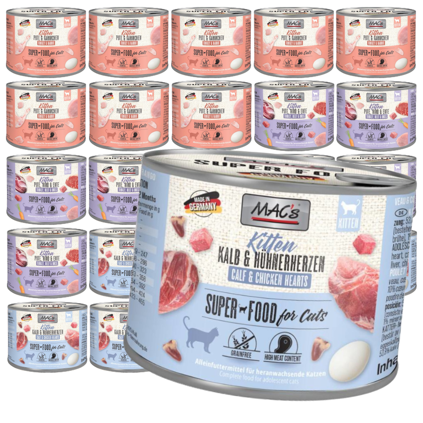 MAC's Kitten to szczególnie smaczne kompozycje smaków, opracowane jako zbilansowana, pozbawiona zbóż, kompletna karma dla kociąt.