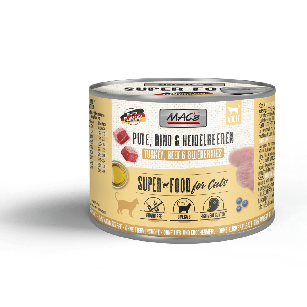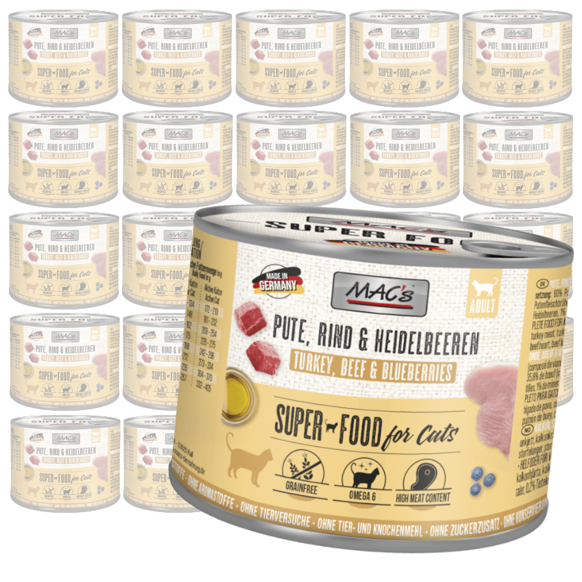 Karma MAC's Turkey, Beef & Blueberries składa się z delikatnego indyka i jest szczególnie smaczna w połączeniu z wołowiną i jagodami.