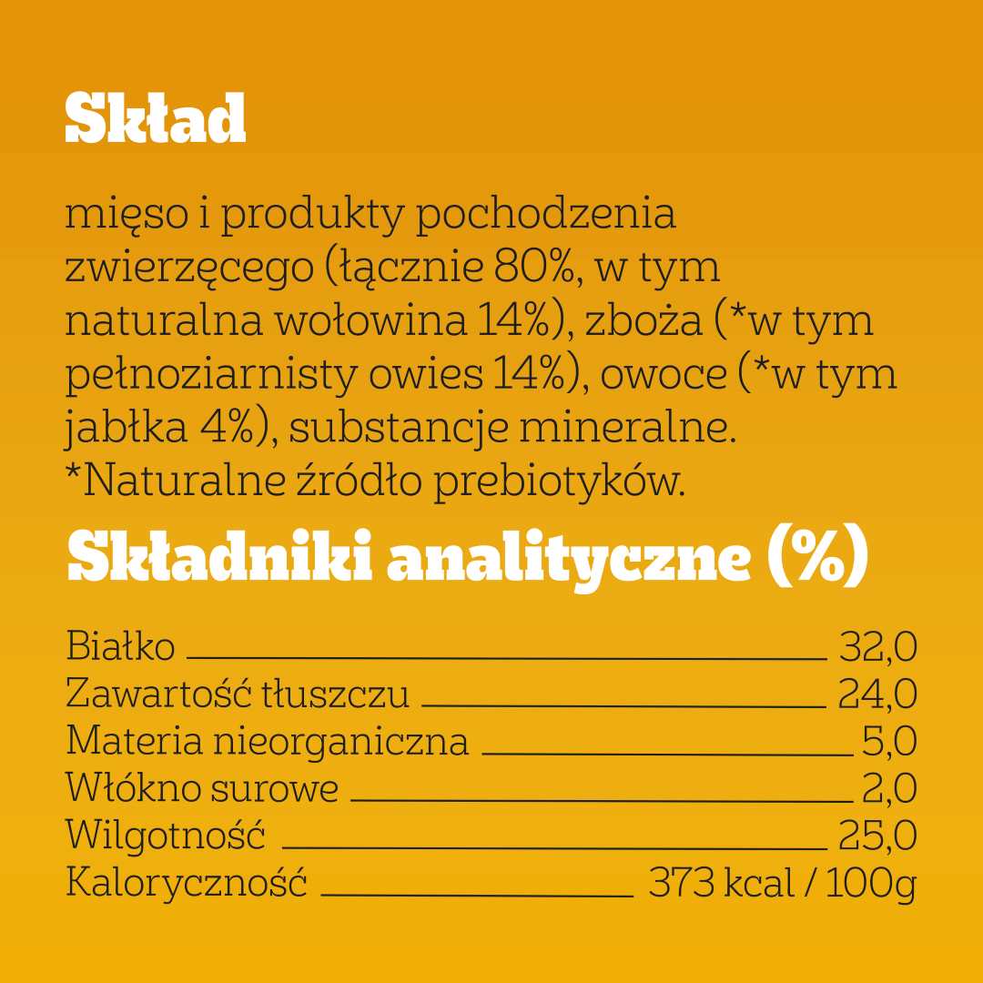 Składniki: mięso i produkty pochodzenia zwierzęcego (łącznie 80%, w tym naturalna wołowina 14%), zboża (*w tym pełnoziarnisty owies 14%), owoce (*w tym jabłka 4%), substancje mineralne. *Naturalne źródło prebiotyków.