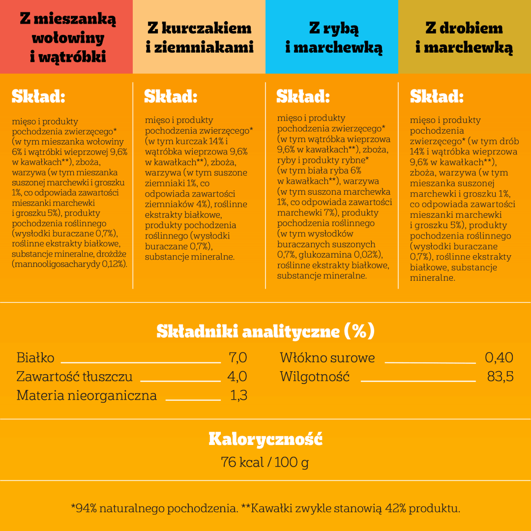Z drobiem i marchewką oraz groszkiem:mięso i produkty pochodzenia zwierzęcego* (w tym drób 14% i wątróbka wieprzowa 9,6% w kawałkach**), zboża, warzywa (w tym mieszanka suszonej marchewki i groszku 1%, co odpowiada zawartości mieszanki marchewki i groszku 5%), produkty pochodzenia roślinnego (wysłodki buraczane 0,7%), roślinne ekstrakty białkowe, substancje mineralne. *94% naturalnego pochodzenia. **Kawałki zwykle stanowią 42% produktu.