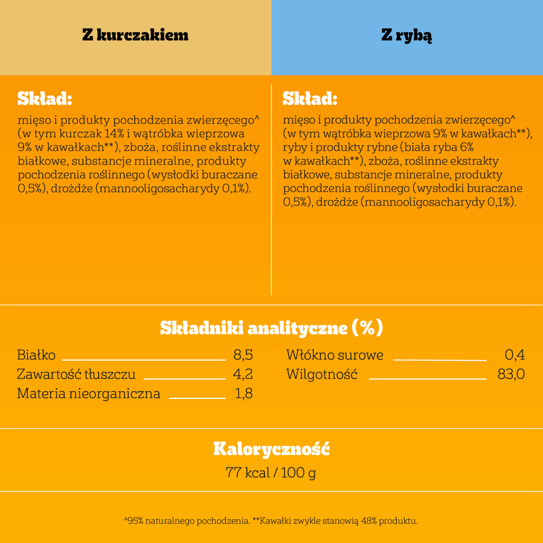 Z rybą:mięso i produkty pochodzenia zwierzęcego* (w tym wątróbka wieprzowa 9% w kawałkach**), ryby i produkty rybne (biała ryba 6% w kawałkach**), zboża, roślinne ekstrakty białkowe, substancje mineralne, produkty pochodzenia roślinnego (wysłodki buraczane 0,5%), drożdże (mannooligosacharydy 0,1%).
