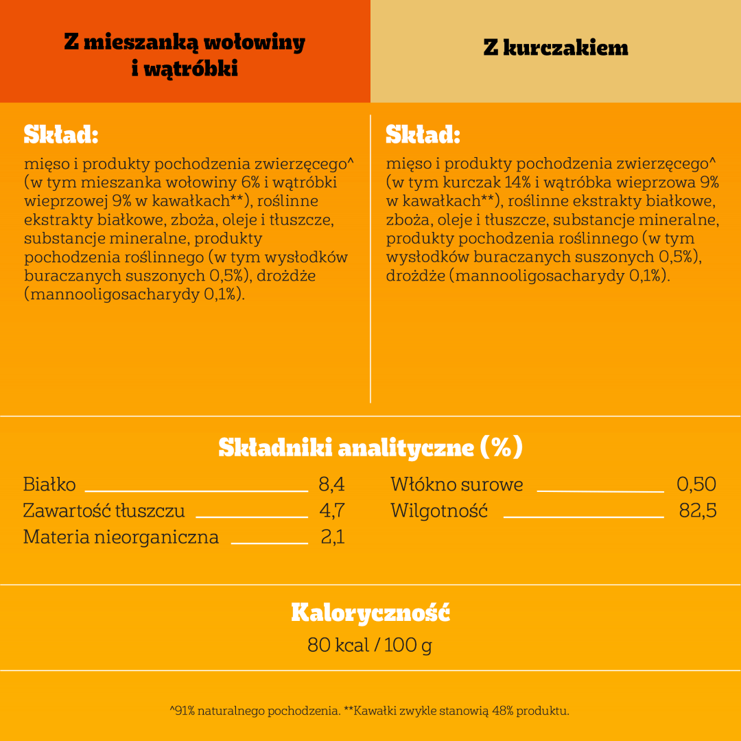 Z mieszanką wołowiny i wątróbki: mięso i produkty pochodzenia zwierzęcego^ (w tym mieszanka wołowiny 6% i wątróbki wieprzowej 9% w kawałkach**), roślinne ekstrakty białkowe, zboża, oleje i tłuszcze, substancje mineralne, produkty pochodzenia roślinnego (w tym wysłodków buraczanych suszonych 0,5%), drożdże (mannooligosacharydy 0,1%).