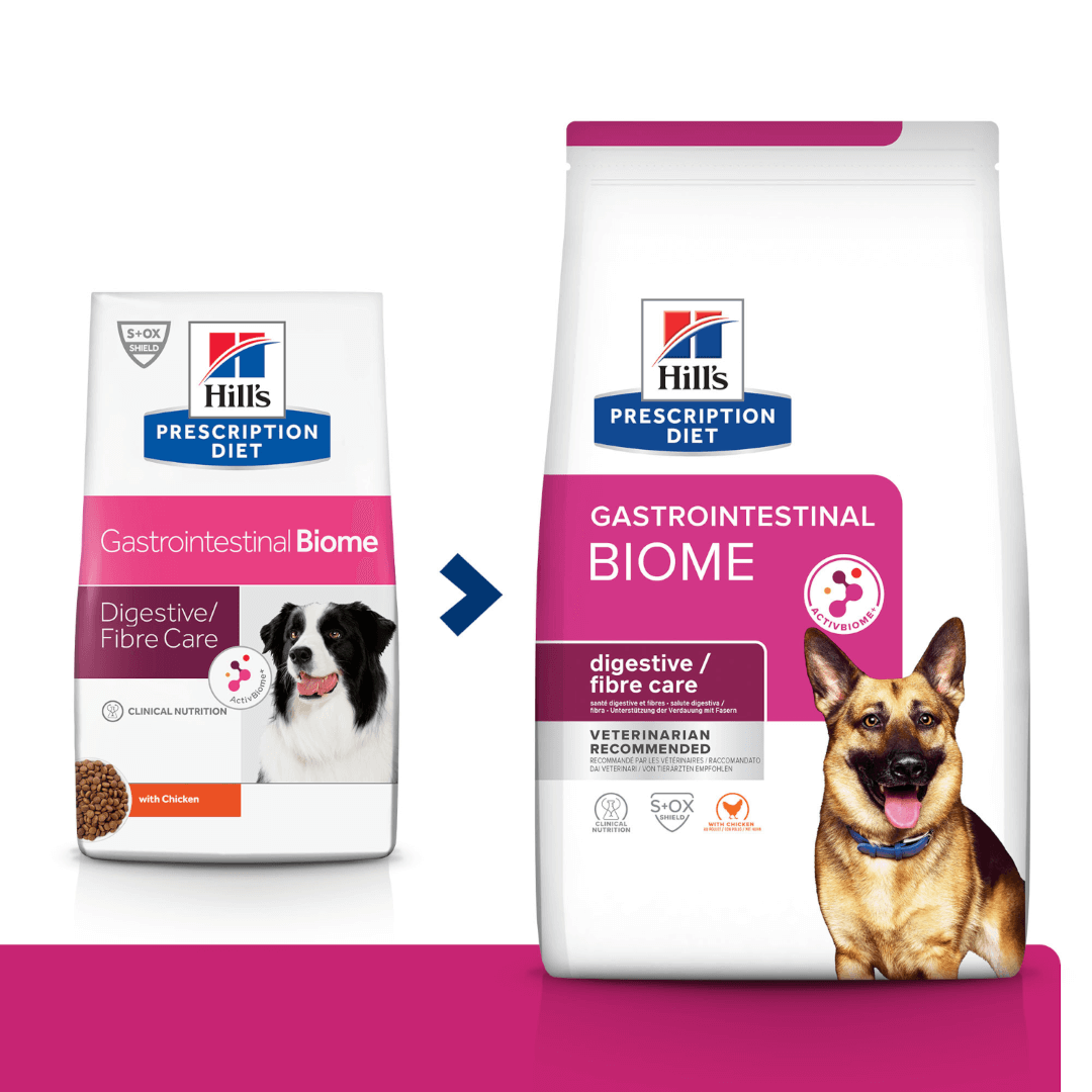 Hill's Prescription Diet Gastrointestinal Biome to sucha karma dla psów o wysokiej zawartości włókna pokarmowego, która, jak wykazano klinicznie, wspomaga regulację zdrowego stolca w ciągu zaledwie 24 godzin i pomaga zmniejszyć ryzyko nawrotów.